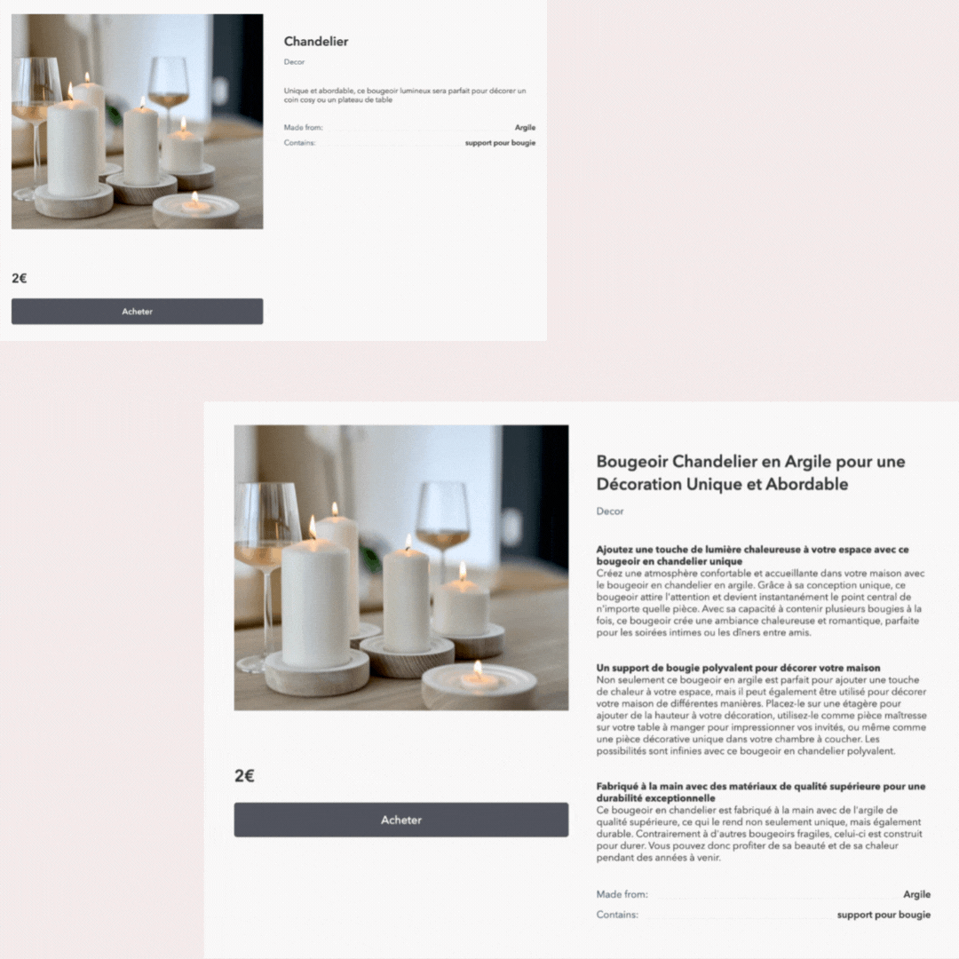 Testez gratuitement Ai-Commerce en renseignant l'adresse d'une de vos pages produits ci-dessous et recevez une fiche d'exemple gratuitement.